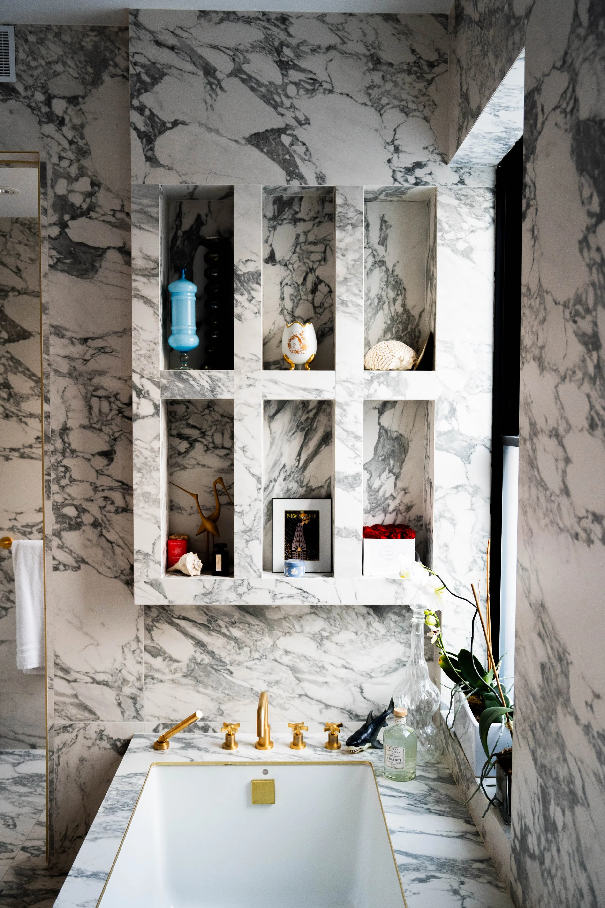 Striking full-height Calacatta marble slabs are meticulously carved to create integrated display niches above a custom vanity, paired with brushed brass fixtures for a sculptural, gallery-like primary bath.